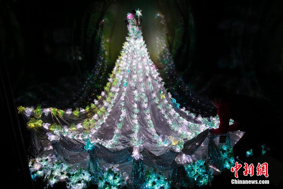 1月20日,在2015中国上海春季婚纱摄影器材展上,多款“光纤婚纱”的亮相吸引了众人的眼球。这种全新的婚纱礼服用光纤以及光纤布、LED灯等制成,光纤布料通过高科技手段将光纤导线织入布料中,使原本普通的纺织物具有传导功能,通过无线遥控就成了“会发光的布”。 中新社发 汤彦俊 摄