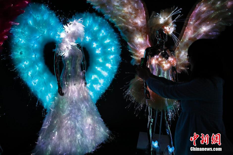 1月20日,在2015中国上海春季婚纱摄影器材展上,多款“光纤婚纱”的亮相吸引了众人的眼球。这种全新的婚纱礼服用光纤以及光纤布、LED灯等制成,光纤布料通过高科技手段将光纤导线织入布料中,使原本普通的纺织物具有传导功能,通过无线遥控就成了“会发光的布”。 中新社发 汤彦俊 摄