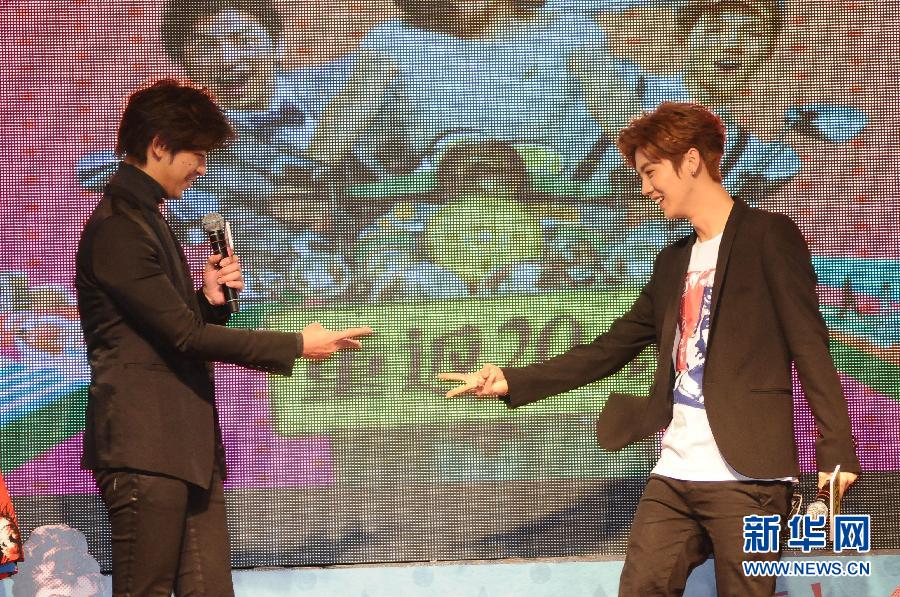 1月19日,演员陈柏霖(左)和鹿晗在电影《重返20岁》在台北的首映式上互动。当日,两岸合作电影《重返20岁》在台北举行首映式,演员鹿晗、杨子姗、陈柏霖和导演陈正道现身宣传。 新华社发