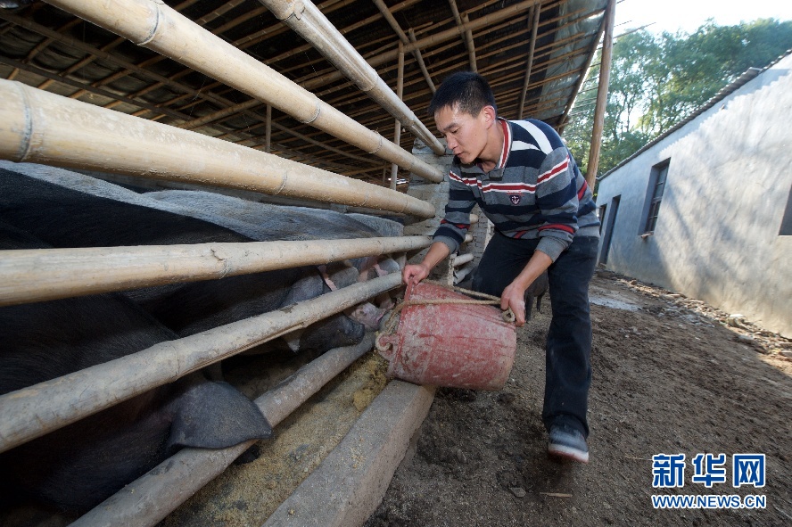 在福州市闽侯县关山村,刘记虎为生猪投食(1月16日摄)。