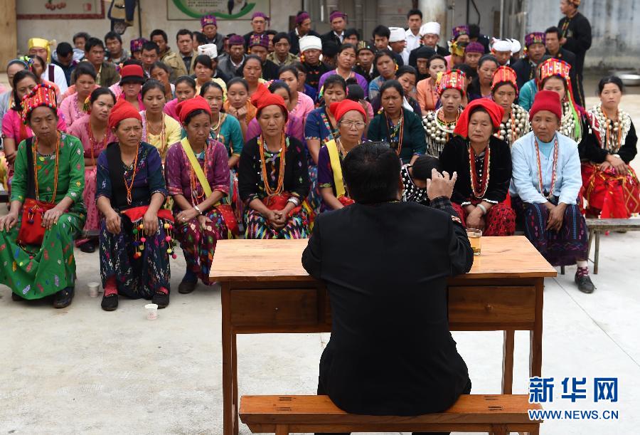 1月17日,宣讲员刘永恩在云南省德宏傣族景颇族自治州陇川县城子镇巴达村委会曼崩坝村民小组用景颇语向村民进行宣讲。近年来,位于中缅边境的云南省德宏傣族景颇族自治州采取“用民族干部宣传、用民族语言讲解、用民族文字阐释、用民族节庆展示、用民族文化体现”的“五用”措施,开展学习宣讲,使用通俗易懂的民族语言、生动鲜活的事例向少数民族群众详细阐释党的创新科学理论,让党的方针、政策在广大群众中家喻户晓,深入人心。目前,德宏州已经组建了州、县、乡、村、组“五用”宣传团(队)856支,宣讲骨干成员2611名。新华社记者 蔺以光 摄