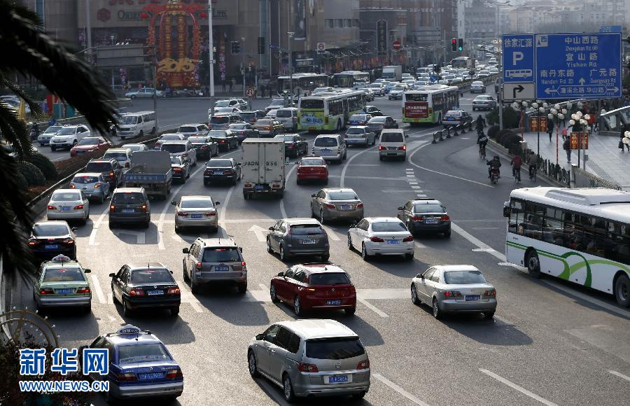 这是上海徐家汇街头的车流(1月17日摄)。当日,上海2015年首次车牌拍卖结果出炉:最低成交价为74000元,平均成交价为74216元,中标率为8.1%,比2014年12月有所上升。新华社记者丁汀摄