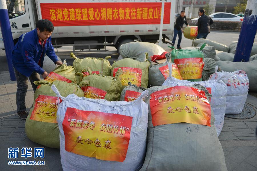 1月17日,工作人员将捐赠的衣物打包装车。当日,一场以“爱暖寒冬,衣旧传情”为主题的衣物捐赠活动在合肥市滨湖新区开展,活动倡议市民将不穿的旧衣物捐赠给新疆需要帮助的人。经过前期的广泛宣传,众多市民及社会团体踊跃捐赠,截至当日下午4点30分,共收到捐赠衣物4000余件,衣物将被直接运往安徽省对口援建的新疆皮山县,为那里的困难群众带去冬日的温暖。新华社记者杜宇摄