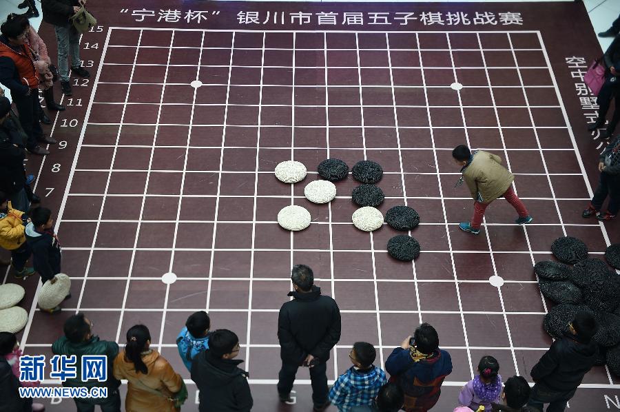 1月17日,参赛选手在巨型棋盘上进行趣味五子棋比赛。当日,“宁港杯”银川市首届五子棋挑战赛在宁夏银川市开赛。比赛分为儿童组、青少组、成人组三个组别进行积分循环赛,最后决出五子棋王。趣味比赛中,一张约10米见方的巨型五子棋盘及100枚大型棋子亮相比赛现场,吸引众多选手在巨型棋盘上一展身手。新华社记者王鹏摄