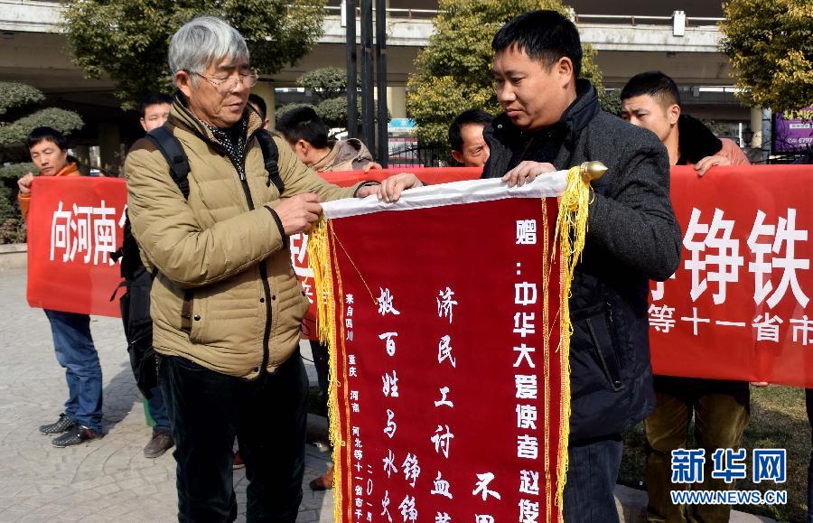 1月17日,赵俊方(前左)接过受助农民工代表送上的锦旗。当日,20余名农民工代表从四面八方赶到河南郑州向义务帮助他们讨薪的“河南好人”赵俊方送上锦旗表达谢意。赵俊方是河南濮阳的一位农民,种过地、打过工、也做过生意,从2012年起,他义务帮助农民工讨薪,至今已讨回7000多万元。 2014年11月16日,通过求助电话,赵俊方又踏上新的助人讨薪之路,他3次自费奔赴山东阳谷县,帮助千余位素不相识的农民工讨要血汗钱。通过向政府部门反映情况、寻求帮助,目前已讨回200多万元。“我会继续帮助他们,直到把欠薪全部讨回。”赵俊方说。多年来,赵俊方曾因打工资助多位贫困学生上学,获评2005年“感动中原十大新闻人物”,又因千里护送素昧平生、在异乡去世的老人“叶落归根”,成为2011年“感动吉林十大人物”,还因汶川震后赴灾区抗震救灾入选首批“四川好人”。新华社记者 李安摄