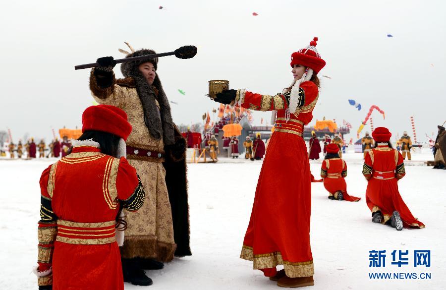 1月18日,第三届辽宁康平卧龙湖大辽文化冬捕节上举行祭湖醒网仪式。当日,为期7天的第三届辽宁康平卧龙湖大辽文化冬捕节在沈阳市康平县卧龙湖开幕,期间举行辽代祭祖仪式、祭湖醒网仪式、品尝鱼头汤、看雪雕等丰富多彩的系列活动。卧龙湖位于沈阳北部,面积127.5平方公里,是辽宁省最大的平原淡水湖。当地的大辽文化冬捕节已经连续举办两届,辽代元素贯穿整个冬捕活动,成为辽宁北部地区独具特色的冬季旅游品牌。新华社发(燕东亮 摄)