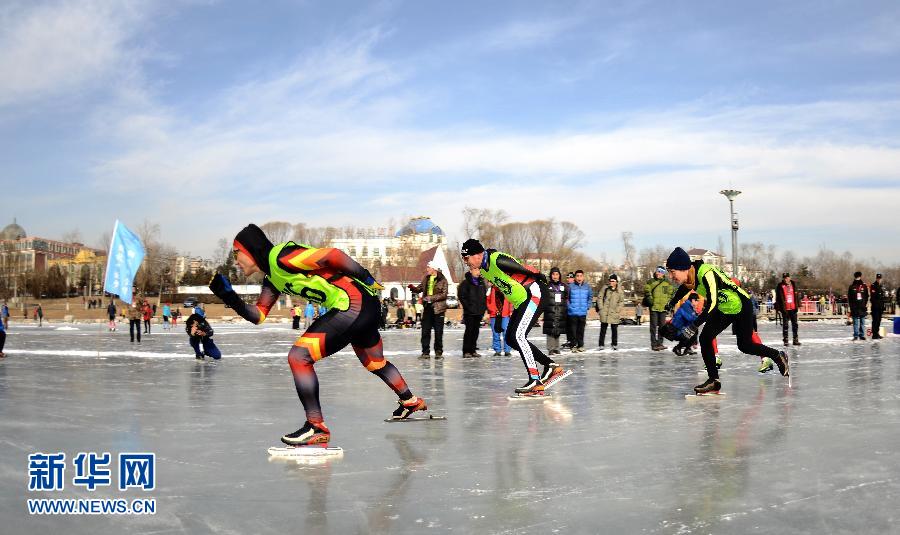 1月17日,参加5000米竞速的爱好者在比赛中角逐。当日,全国大众速度滑冰马拉松赛在北京延庆鸣枪开战,来自黑龙江、吉林、北京、青海等地的300余名爱好者参赛。该项赛事共分三站,分别在河北承德、北京延庆、新疆喀纳斯湖举行,是2014—2015全国大众冰雪季系列活动之一。新华社记者张宇摄