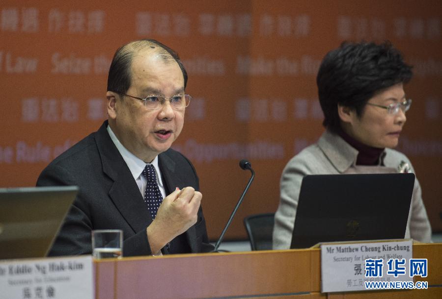 1月15日,香港特区政府劳工及福利局局长张建宗在记者会上发言。当日,香港特区政府政务司司长林郑月娥在就2015年施政报告中有关人口政策举行的记者会上表示,自1997年香港回归以来,通过“单程证”制度从内地来港定居的人士超过80万,是香港近年人口增长的主要来源,不担心此制度会造成文化差异和矛盾。新华社记者 何靖嘉 摄