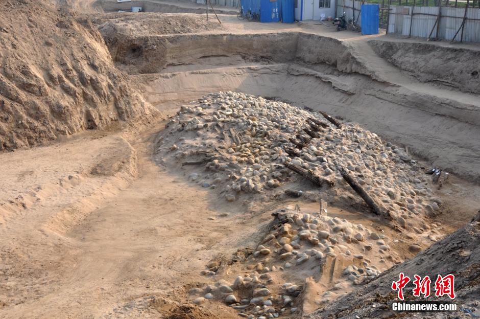 1月15日,陕西省文物局透露,考古人员对位于西安市北郊汉长安城遗址北侧的渭桥遗址发掘后确定,以厨城门外的一座桥为中心在东西600米的范围内,已发现存在5座大型渭河桥梁。考古专家表示,如此高密度的中国古代大型桥梁,在考古学上为首次集中发现。图为厨城门一号桥解剖处出土的带瓦当筒瓦。中新社发 张远 摄