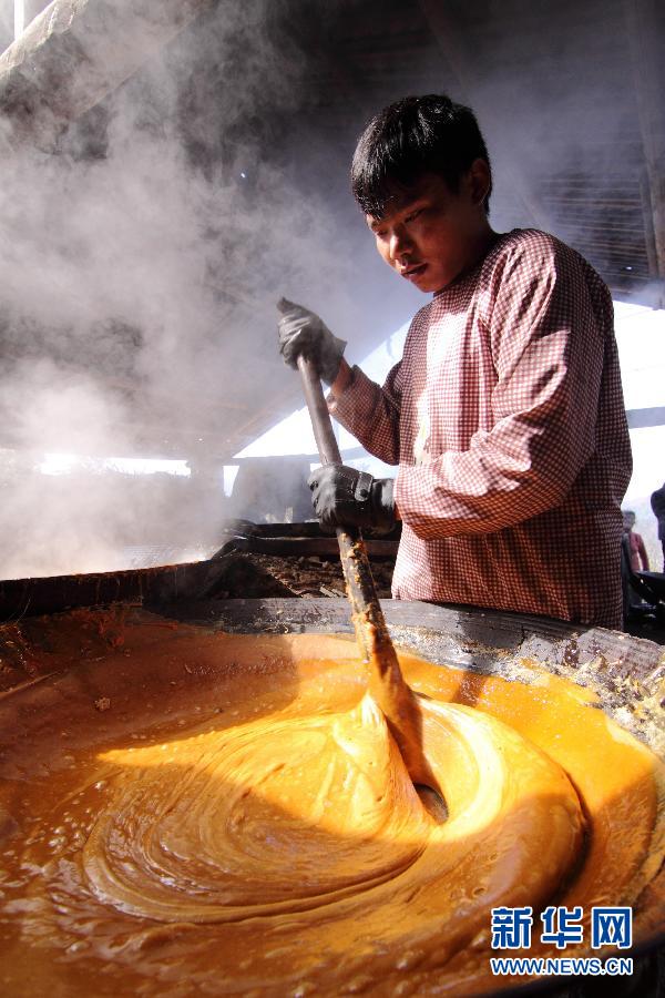 1月15日,广西隆林各族自治县革步乡平安村一名村民按传统制糖工序搅糖。春节临近,广西百色市隆林各族自治县的壮族群众开始忙着用传统土法制作红糖片,供应节日市场。生产出来的红糖片除满足本地需求外,主要销往云南、贵州等地。新华社发(林斌 摄)