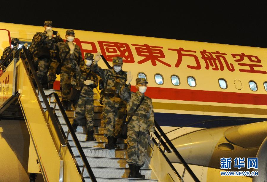 1月16日,中国援非抗埃医疗队队员走出机舱,向接机人员挥手致意。当日凌晨5时许,中国援助利比里亚抗击埃博拉医疗队首批第一组82名队员凯旋抵达重庆。根据统一安排,为便于与第二批援利医疗队轮换交接,首批援利医疗队164人分两批包机回国。据了解,首批援利医疗队第一组队员回国后,将进行为期21天的医学观察,其余队员将在完成与第二批援利医疗队工作交接后于22日回国。新华社记者 唐奕摄