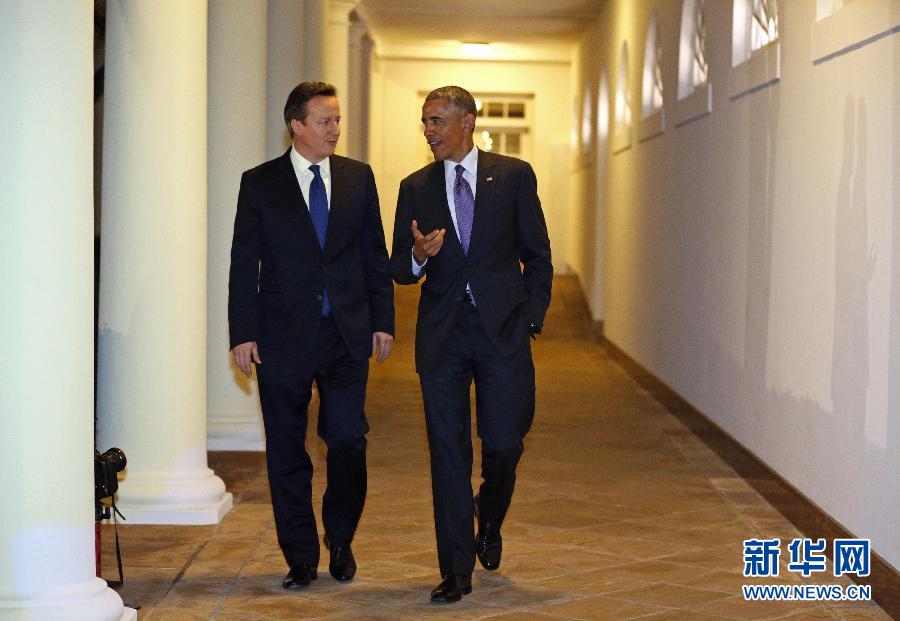 1月15日,在美国华盛顿白宫,美国总统奥巴马(右)与到访的英国首相卡梅伦同赴工作晚宴。 新华社/路透