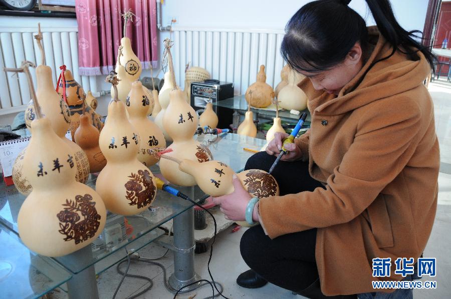 “葫芦王”刘石安的妻子薛改莲在葫芦上烙制羊年剪纸画图案(1月21日摄)。山西省文水县距离县城20多公里的吴村几乎家家都种葫芦,收获的葫芦大部分被村里的“葫芦王”刘石安收购,他的妻子等20余名手工艺者用葫芦做烙画,成品销往北京、上海、天津以及香港、台湾等地。随着羊年春节的临近,花开富贵、羊年吉祥等迎新春图案被烙制在葫芦上,烘托出浓浓的年味。新华社记者马志异摄