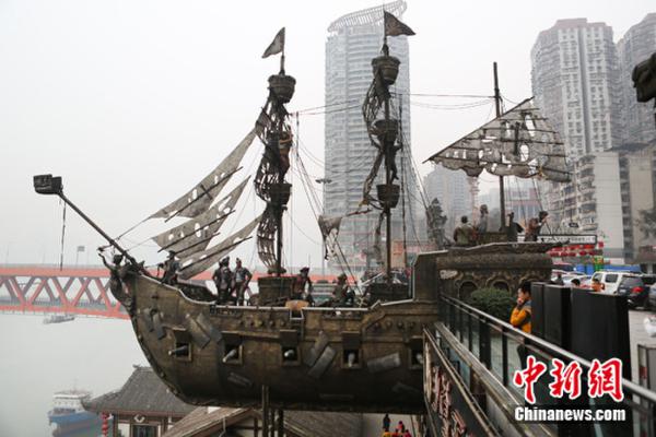 近日,山城重庆街头靠近长江一处的一艘外形酷似电影《加勒比海盗》中的海盗船雕塑格外的吸引游客们的目光,惟妙惟肖的”海盗“和场景还原,给城市增添了一道别样的风景。 中新社发 泱波 摄