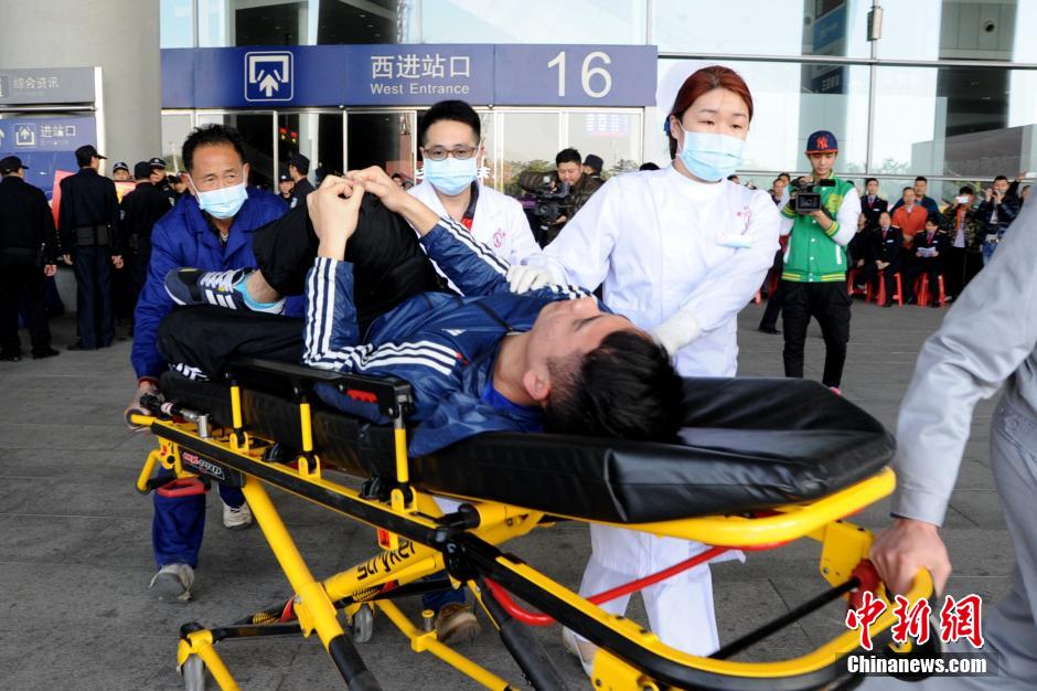 1月22日,由市春运办、广铁集团、广州南站地区春运指挥部举办的2015年春运应急综合演练在广州南站举行。本次演练的内容包括安抚滞留旅客情绪、踩踏事件应急疏散,以及一系列解救人质、抓获暴徒、救治伤员的暴力袭击处置演练。中新社发 朱嘉玮 摄