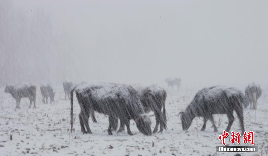 1月21日,牛群在新疆阿勒泰地区布尔津县冲乎尔镇克孜勒塔斯村农田里风雪中吃草。皮钢 摄