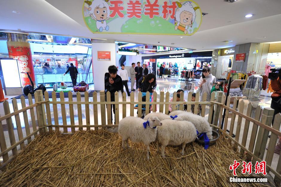 1月23日,山西太原,一家高档商场为了迎接农历羊年到来,开辟羊圈饲养了5只可爱的绵羊,吸引不少顾客围观。中新社发 韦亮 摄