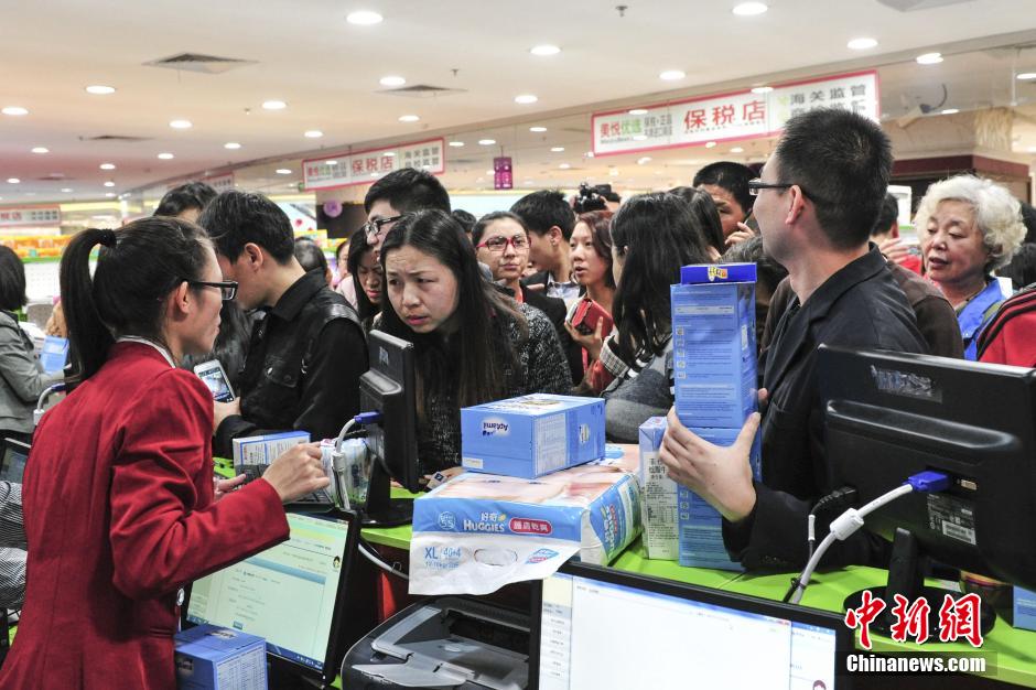 1月23日,广州首家跨境直购体验店在珠江新城正式试业,收银台前大排长龙。体验店以母婴用品、生活家居、美肤护理、红酒洋酒为主打,商品种类多、小额免征税,消费者凭身份证信息实名购买,现场下单提货。中新社发 陈骥旻 摄