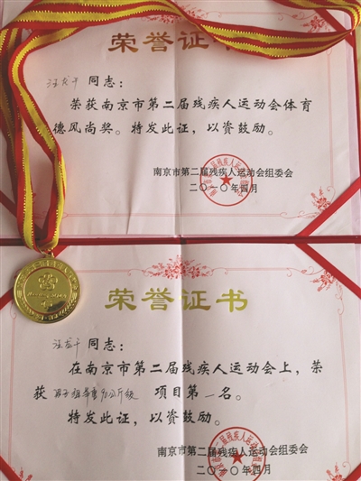 为了能够尽量少让家里人照顾,汪龙干很注意锻炼身体,腿部有残疾不能锻炼,他就练习举重锻炼上肢力量。每次锻炼他都忍受着常人难以想象的痛苦。2010年,汪龙干参加了南京市第二届残疾人运动会,获得了90公斤级的举重冠军,并荣获那届赛事的道德风尚奖。(记者 焦哲)