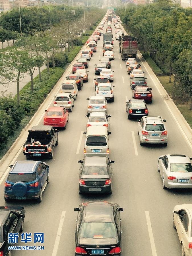 1月24日,车辆在广西南宁市秀厢大道上缓慢行驶。近年来,广西南宁市机动车保有量快速增长,根据南宁市车管所的数据,截至2014年底,全市机动车保有量已经超过165万辆。 新华社记者黄孝邦 摄