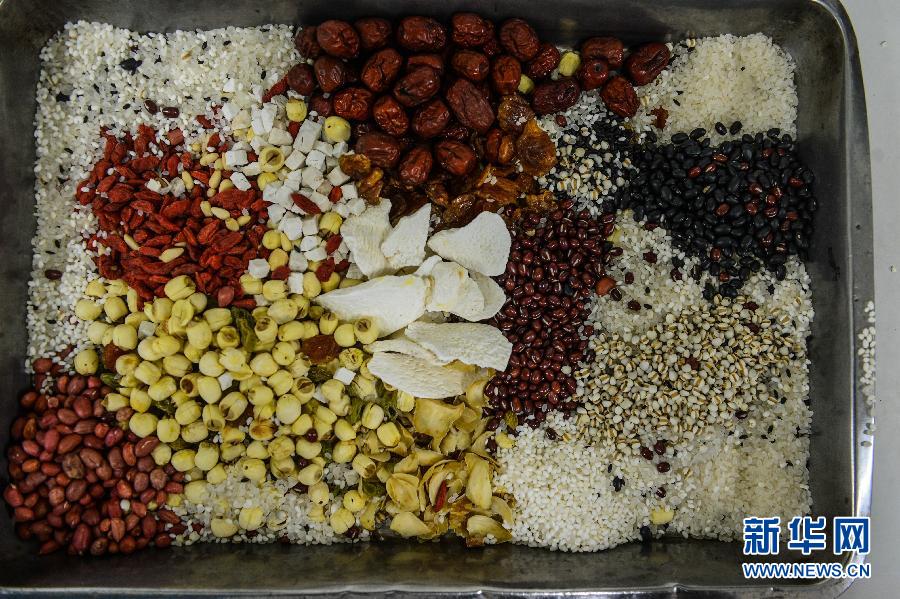 这是熬制腊八粥的18种传统食材(1月26日摄)。当日,杭州传统老字号中药房“方回春堂”的工作人员加紧熬制传统腊八粥,准备第二天腊八节时将3万份腊八粥全部送给市民百姓们分享。腊八粥有18种材料,主料为糯米、晚粳米和黑米,配料除赤豆、花生、米仁、红枣、莲子、桂圆老六样外,还有豇豆、葡萄干,为了能更好地起到健脾胃的作用,又加入了枸杞、山药、茯苓等中药材。浓浓的腊八粥将不仅带给人们营养的美味,也把浓浓的传统年味传递开来。 新华社记者 徐昱 摄