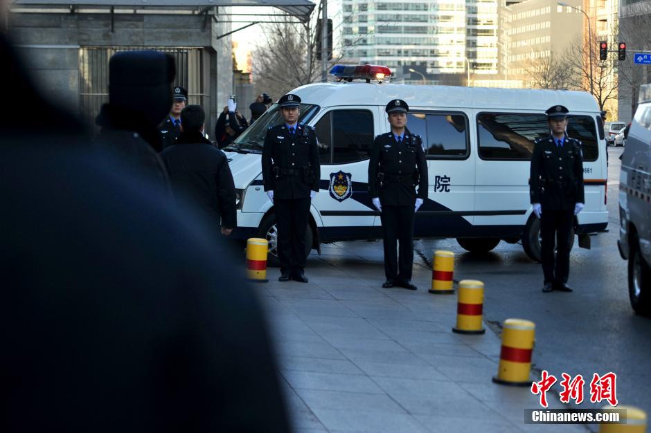 1月27日上午10点半,张国立之子张默涉嫌容留他人吸毒一案将在海淀法院公开开庭审理。记者采访第三方律师了解到,从张默被抓视频来看,由于他是“人赃并获”,又是二度吸毒被抓,所以从量刑上看,可能比李代沫、房祖名要更重一些。图为载有张默的警车驶入法院。中新网记者 金硕 摄