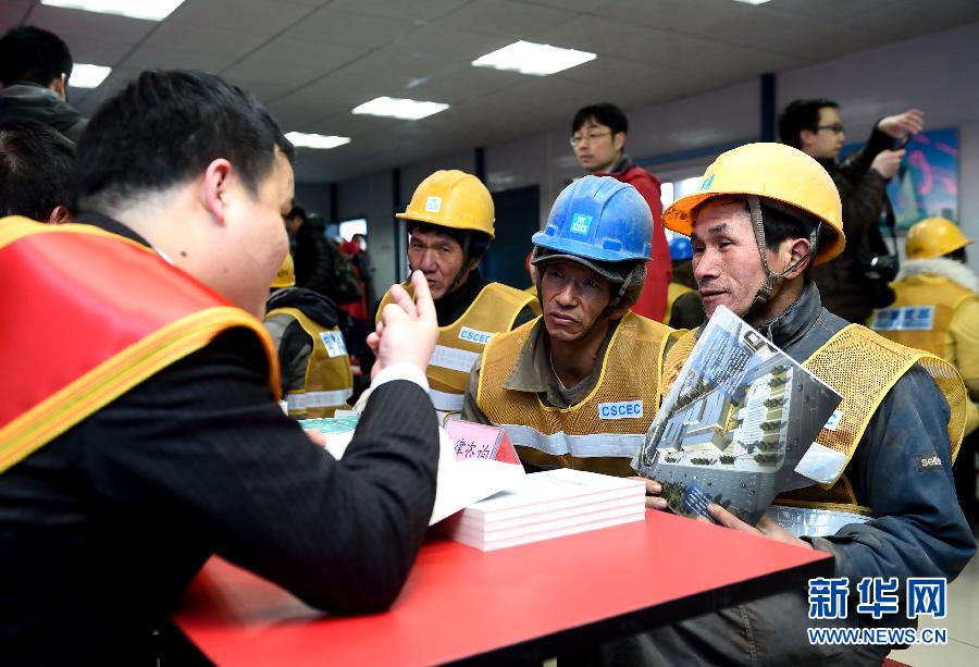 1月27日,在北京大吉片公建项目工地,律师向农民工提供法律咨询服务。当日,中国志愿服务联合会职工委员会在北京举行2015年春节“送温暖”全国职工志愿服务活动启动仪式。春节临近,各地工会将组织广大职工志愿者根据能力和特长,为农民工和困难职工提供法律援助、医疗救助、就业指导、心理疏导等志愿服务。新华社记者金良快摄