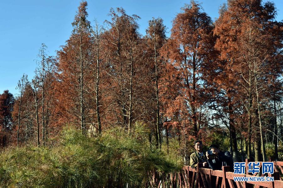 两位摄影爱好者在拍摄西亮塘湿地冬景(1月26日摄)。