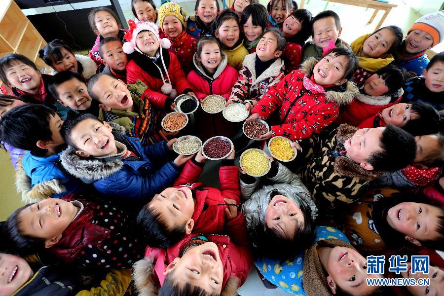 1月27日,江苏东海县驼峰乡中心幼儿园的小朋友手捧制作腊八粥的食材合影。当日是农历腊月初八,民间有用五谷杂粮熬制腊八粥的习俗。江苏东海县驼峰乡中心幼儿园小朋友在老师的指导下学习辨识制作腊八粥的食材,体味民俗文化。新华社发(张开虎 摄)