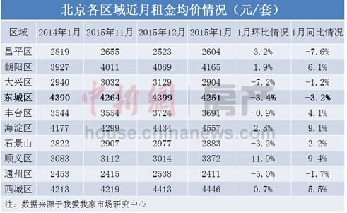 据我爱我家向中新网房产频道提供的数据,截止1月26日,北京10大区域中5个区域房租环比下跌,除丰台区、大兴区、通州区等郊区,主城区之一的东城区房租也迎来下调,环比跌幅3.4%,同比跌幅3.2%。