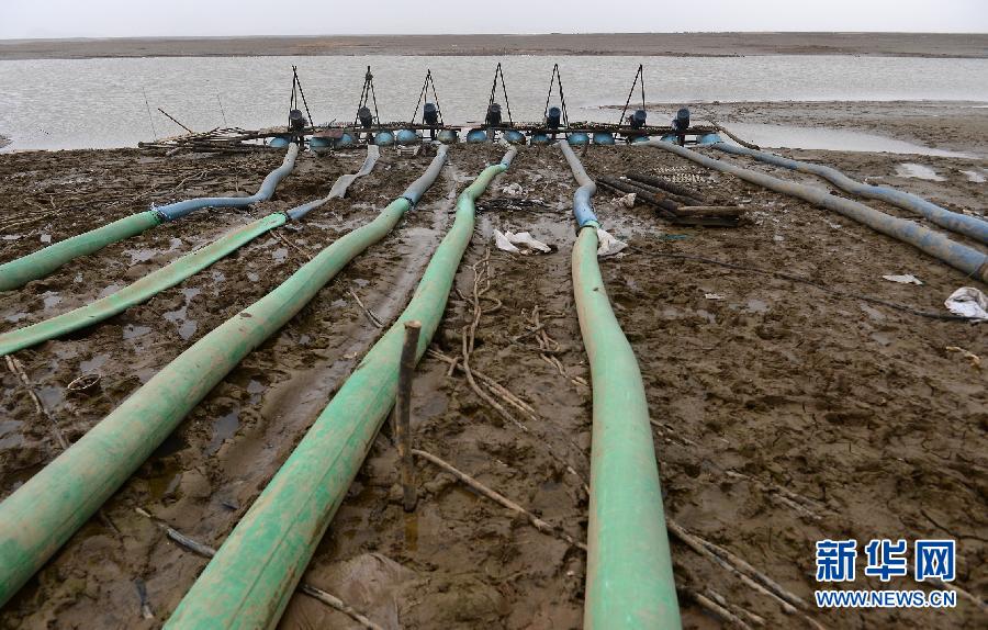 1月31日9时,鄱阳湖标志性水文站点星子站水位为8.01米,逼近8米的极枯水位。受降水偏少,上游来水减少等因素影响,鄱阳湖出现持续低枯水位。据江西都昌县自来水公司介绍,县城18万人口用水仅靠深入湖面的7台水泵24小时不间歇取水获得,在枯水期,此种现象已持续了10年之久。鄱阳湖水位持续低枯,已对湖区居民生活、农业生产造成不利影响。新华社记者 万象 摄