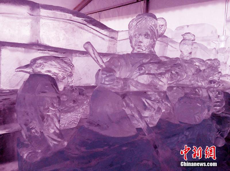 2月3日,100余种冰雕卡通人物山西太原杨家峪锦林百花园。梦幻城堡、冰雪迷宫、小熊维尼、魔幻冰岛、迪士尼欢乐世界、喜洋洋,灰太狼,米奇等主题冰雕作品分散在园中,伴随着儿童歌曲,白天冰雕晶莹剔透,夜晚时,灯光照射在冰雕人物上,更加迷人。张怡 摄