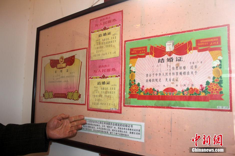 2月3日,河南开封禹王台公园内,64岁的张洪军在园内自费开办了“汴梁婚俗文证博物馆”,供市民免费游览。展馆内收藏了从清代乾隆年间到现代的各式结婚证2000余张,令参观者大饱眼福。图为张洪军收藏的中国“文化大革命”时期的结婚证,极具当时的时代政治特色。马义恒 摄