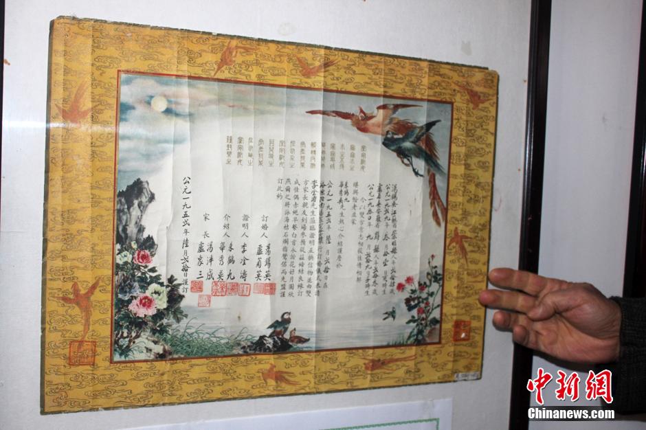 2月3日,河南开封禹王台公园内,64岁的张洪军在园内自费开办了“汴梁婚俗文证博物馆”,供市民免费游览。展馆内收藏了从清代乾隆年间到现代的各式结婚证2000余张,令参观者大饱眼福。图为中国50时代的结婚证,制作精美如同工艺画,一定程度上反映当时对待婚姻的重视。马义恒 摄