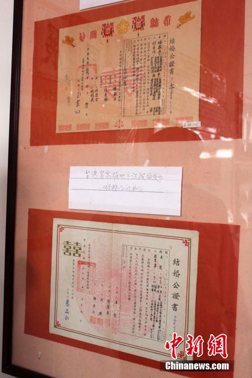 2月3日,河南开封禹王台公园内,64岁的张洪军在园内自费开办了“汴梁婚俗文证博物馆”,供市民免费游览。展馆内收藏了从清代乾隆年间到现代的各式结婚证2000余张,令参观者大饱眼福。图为张洪军收藏的台湾地区的结婚证。马义恒 摄
