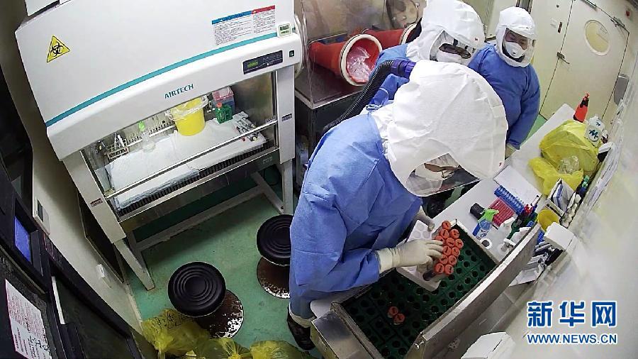 1月31日,在塞拉利昂首都弗里敦中塞友好医院的中国移动实验室内,中国检测队员准备对埃博拉病毒样本进行水浴灭活。当日,记者跟随中国实验室检测队姜涛、赵光宇两名队员,“全副武装”地进入中国援塞移动式生物安全三级实验室,与埃博拉病毒面对面,直击病毒样本检测第一线工作。新华社发 监控视频截图 图片来源:新华网