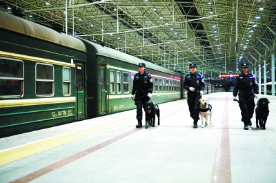 ▲女子警犬队在训练场集结,准备出发走上春运保障岗位。队员与警犬从右至左依次为周雅婷(豆豆)、刘柳(芦村)、陈敏思(毛毛)、韩雪冰(拉拉)、张灵(小黑)、高永利(翩翩)、李达(迦娜)、王弈娟(皮皮)。