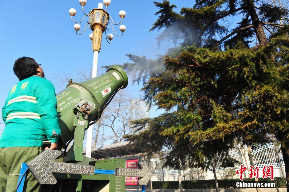 2月5日,在河北石家庄市裕华路主干道上,风筒车和洒水车正在对路边的雪松进行冲洗,原本灰头土脸的大树,经过喷洒冲洗立刻露出了原本绿色。2014年入冬以来,当地几乎没有出现过有效降水,干冷的天气不仅给大地带来严重干旱,也使常绿植物布满灰尘,难以自净。为确保绿色植物安全过冬,石家庄园林部门开始为常绿植物洗澡除尘,并实施冬季抗旱为土壤保墒。 中新社发 翟羽佳 摄