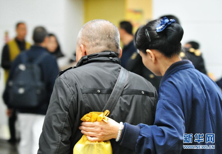 2月5日,大陆赴台乘客家属(左)在志愿者的搀扶下走入厦门高崎机场。