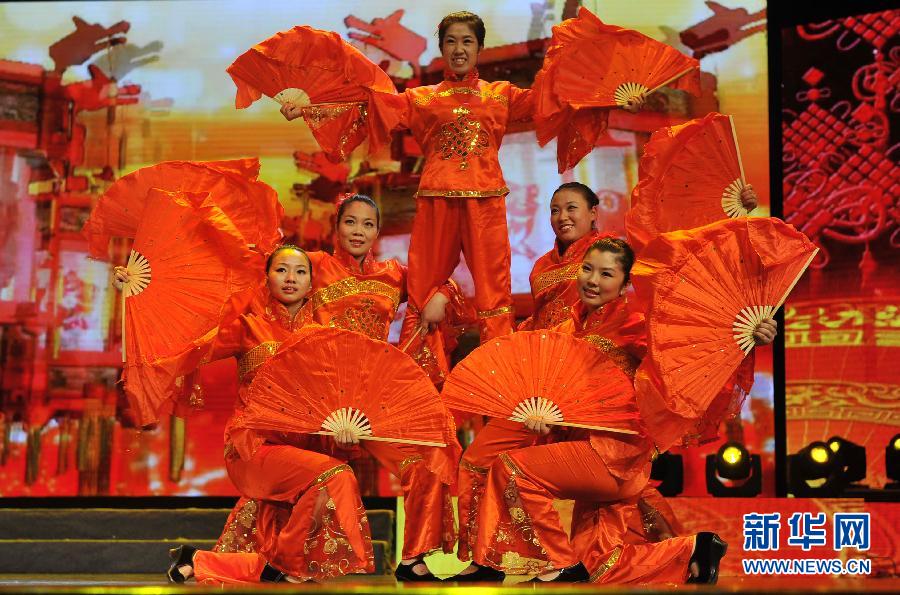 2月4日,演员们在“百姓春晚”上表演舞蹈《开门红》。当晚,“2015家在固安百姓春晚”在河北省固安县的固安大剧院上演。当地社区居民和在校学生等共同带来歌舞、戏曲、朗诵等群众自编自演的文艺节目,喜迎新春佳节。新华社记者鲁鹏摄