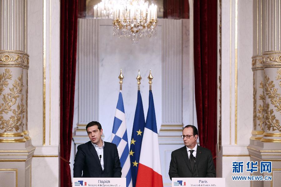 2月4日,在法国巴黎,法国总统奥朗德(右)与希腊总理齐普拉斯出席记者会。法国总统奥朗德4日在巴黎爱丽舍宫会见了来访的希腊总理齐普拉斯。奥朗德呼吁在欧盟规则内通过对话解决希腊债务危机。新华社发(埃蒂安·洛朗摄)