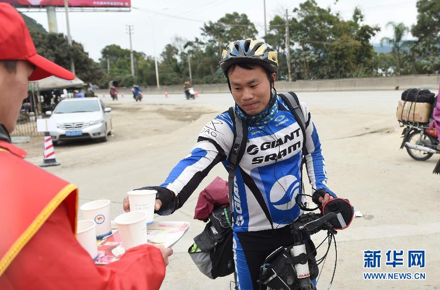 2月4日,林富荣在321国道广西梧州段的一处春运服务站喝水。 2月1日,27岁的广西平南县小伙林富荣骑上自行车,从他打工的广东省中山市启程,踏上400多公里的返乡之路。喜欢自行车运动的林富荣在中山市一家酱油厂工作,往年都是坐车返乡过年。由于今年工厂放假较早、时间充裕,便尝试骑自行车回家,计划2月5日到家。新华社记者 黄孝邦 摄