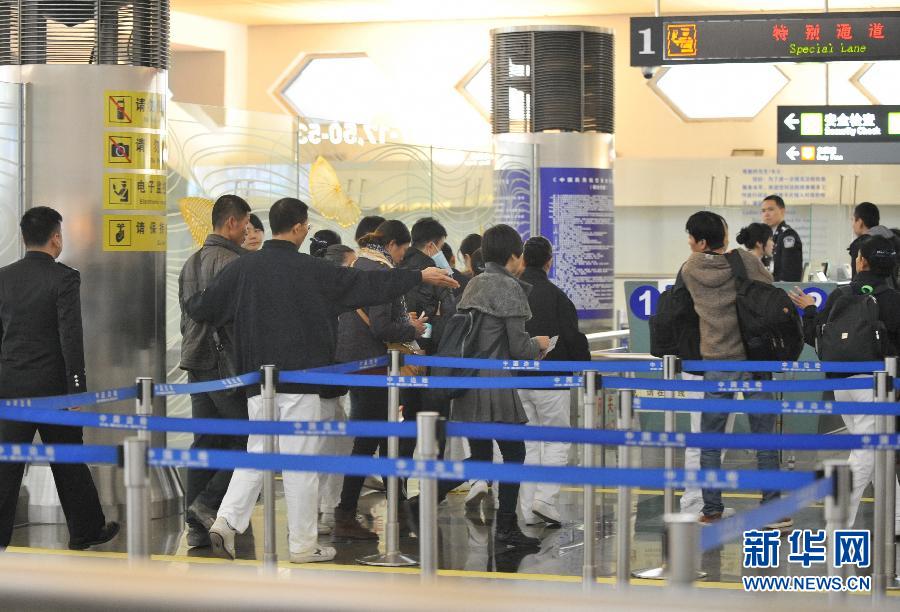 2月5日,赴台的大陆乘客家属和工作人员走向厦门高崎机场安检通道。