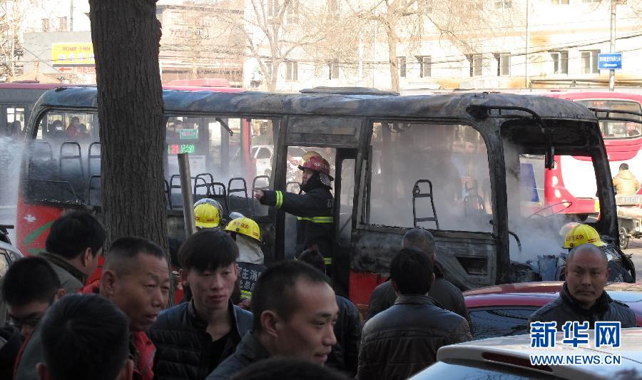 2月5日,一辆中巴车在河北石家庄新华路和公里街交口处自燃,中巴车烧成了空壳,没有造成人员伤亡。 新华社发(孙晓龙摄)