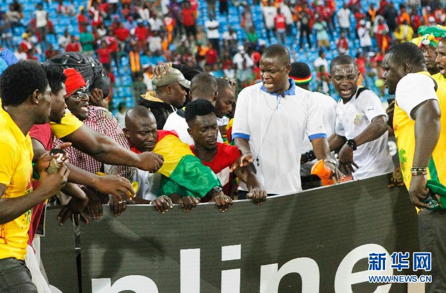 2月5日,加纳球迷冲击场地挡板。 新华社记者李京摄