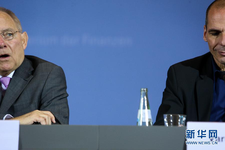 2月5日,在德国柏林,德国财政部长朔伊布勒(左)与希腊财政部长瓦鲁法基斯出席新闻发布会。当日,德国财政部长朔伊布勒会见了来访的希腊财长瓦鲁法基斯。 新华社记者张帆摄