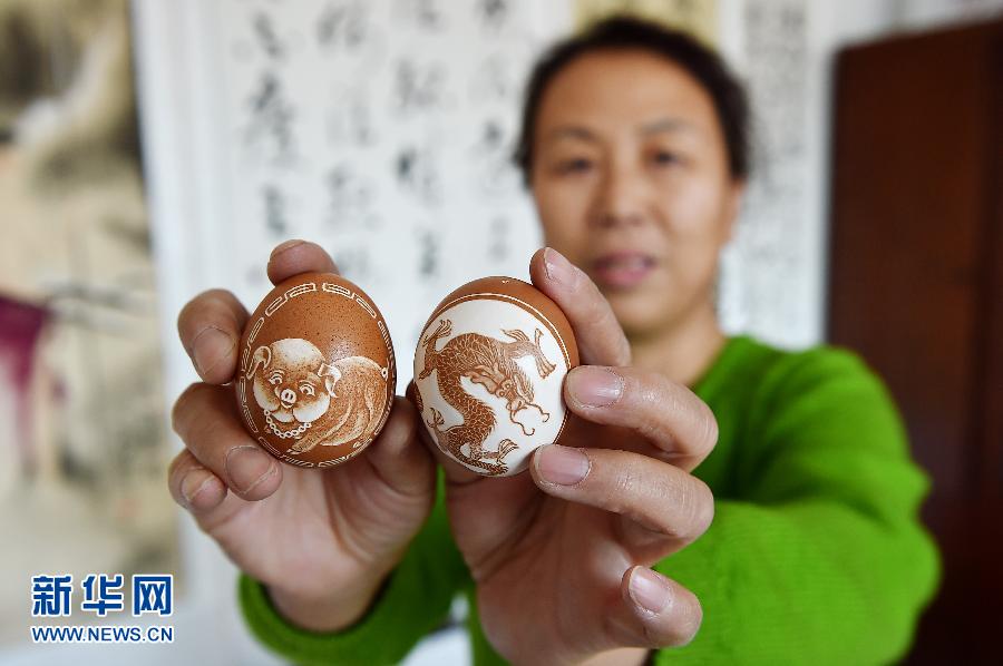 明霞展示蛋雕作品(2月4日摄)。宁夏石嘴山市民明霞从小酷爱艺术创作,自学蛋雕技艺十多年,一个个普通蛋壳在明霞的雕刻刀下,变成一件件栩栩如生的艺术作品。其作品题材多样,花鸟鱼虫、生肖动物等一应俱全。据了解,鸡蛋壳的厚度仅有0.3毫米左右,创作这样一件蛋雕作品大概要用3天时间。新华社记者 王鹏 摄