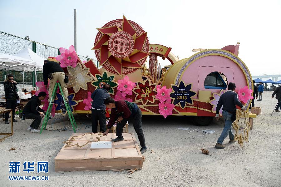 2月5日,工作人员制作“羊洋喜气花车巡游汇演”花车。当日,澳门特区旅游局在澳门旅游塔前地介绍“羊洋喜气花车巡游汇演”花车制作过程。“羊洋喜气花车巡游汇演”将于2月21日(年初三)以及2月28日(年初十)举行,香港歌手许志安和杨千嬅将作为表演嘉宾出席。新华社记者张金加摄