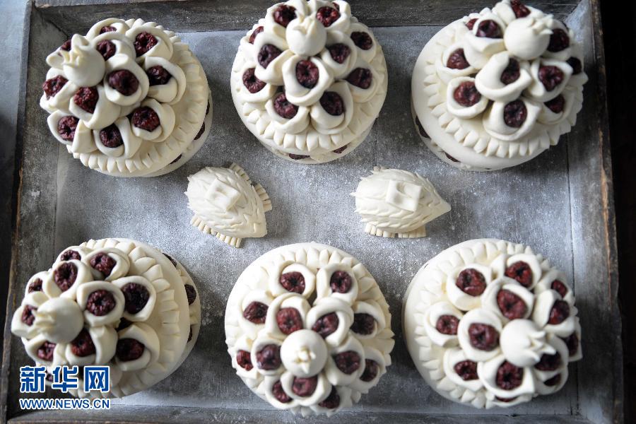 山东省茌平县堤头袁村村民穆广友和袁晓荣夫妇制作的花糕(2月6日摄)。春节临近,山东省茌平县贾寨镇堤头袁村村民穆广友和袁晓荣夫妇就开始忙活起花糕生意。他们做的各式各样的花糕、花馍等俏销当地,不但增加了经济收入,同时也为新春增添浓浓的年味。在山东鲁西地区有春节蒸花糕、花馍的习俗,当地农民用红枣和面粉制作成花糕、花馍和面刺猬、枣花等面食,寓意生活一年比一年好,迎接农历新年的到来。新华社发(赵玉国 摄)