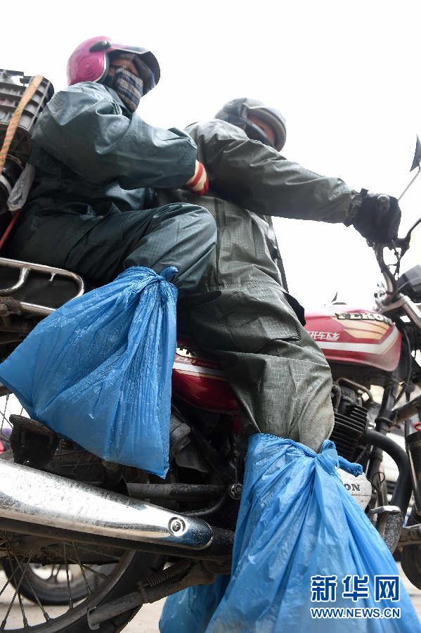 2月5日,在321国道广西梧州段一处春运爱心服务站,两名骑行返乡者的脚上套着塑料袋。新华社记者 黄孝邦 摄